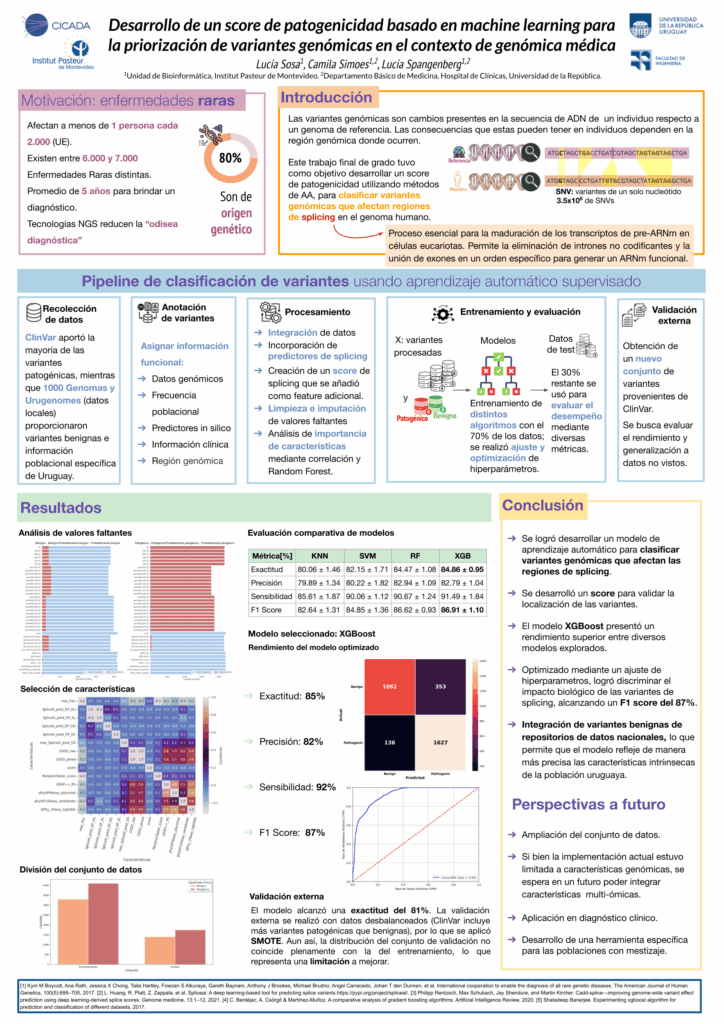 Este trabajo tuvo como objetivo desarrollar un score de patogenicidad mediante métodos de aprendizaje automático, enfocado en la clasificación de variantes genómicas que afectan el mecanismo de splicing. Este score está orientado a mejorar el diagnóstico de pacientes con enfermedades genéticas, con énfasis particular en las enfermedades raras. Para este estudio, se recolectaron variantes de tres bases de datos principales: ClinVar, 1000 Genomas y Urugenomes (datos locales). ClinVar proporcionó la mayoría de las variantes clasificadas como patogénicas, mientras que 1000 Genomas y Urugenomes aportaron variantes consideradas benignas (sin efecto deletéreo), además de información poblacional específica para Uruguay.